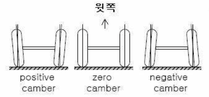 (1) 캠버(camber) : 차량 정면에서 보았을 때 기울기 (정캠버 vs 영캠버/역캠버)